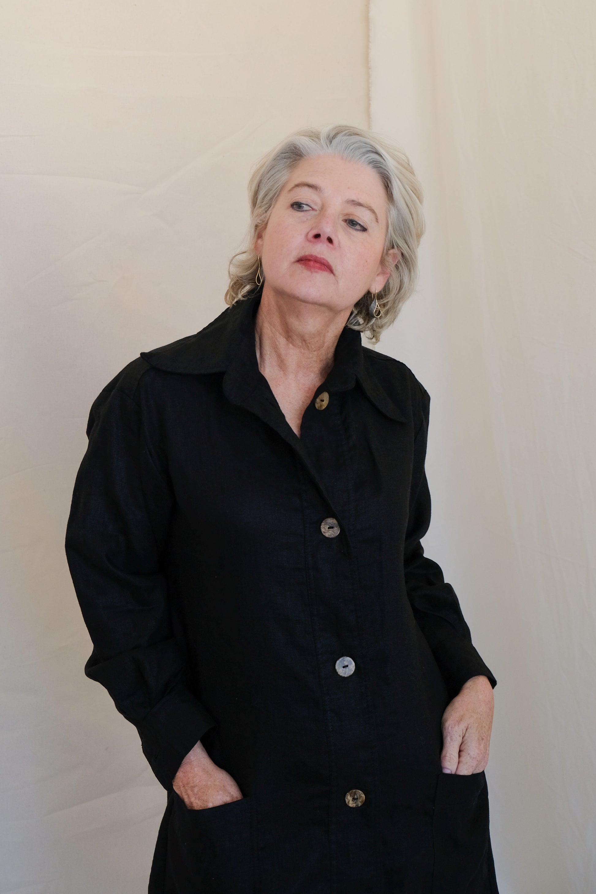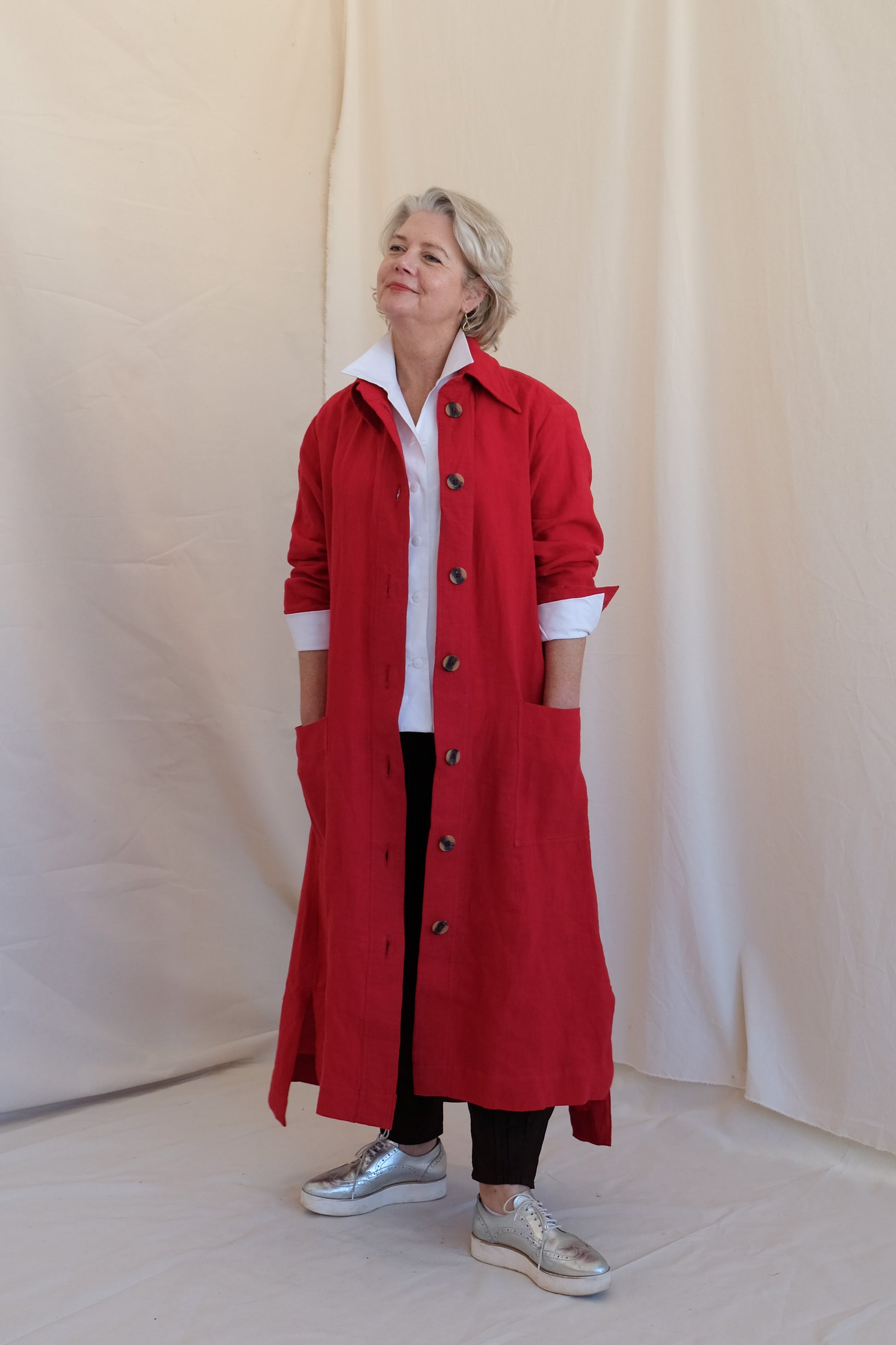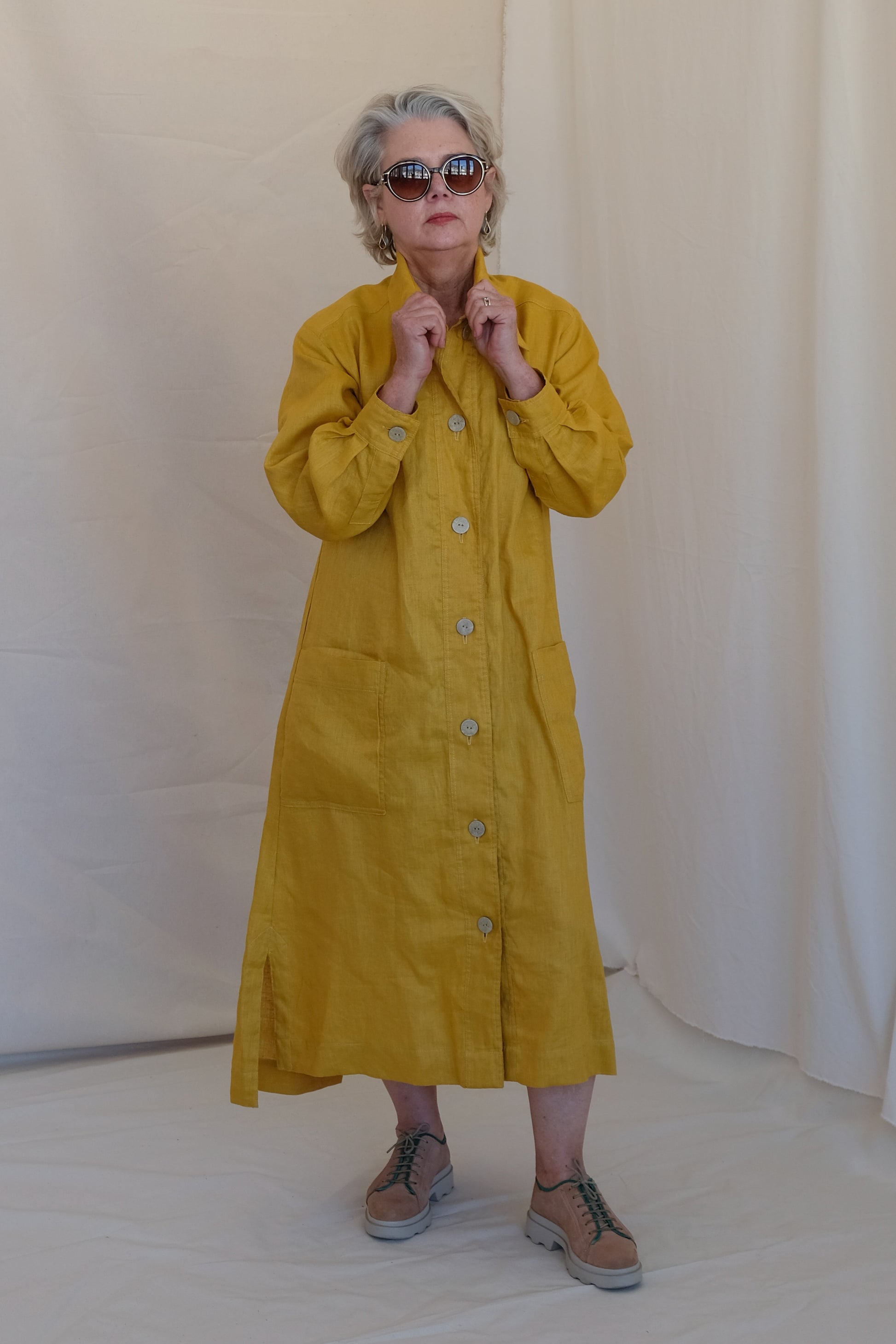 This item is made from 100% linen. It has a generous fit, back pleat, deep pockets and side slits. Pair it with pants and a warm scarf on cold days. Wear it as a dress, belt it or wear it as a coat.